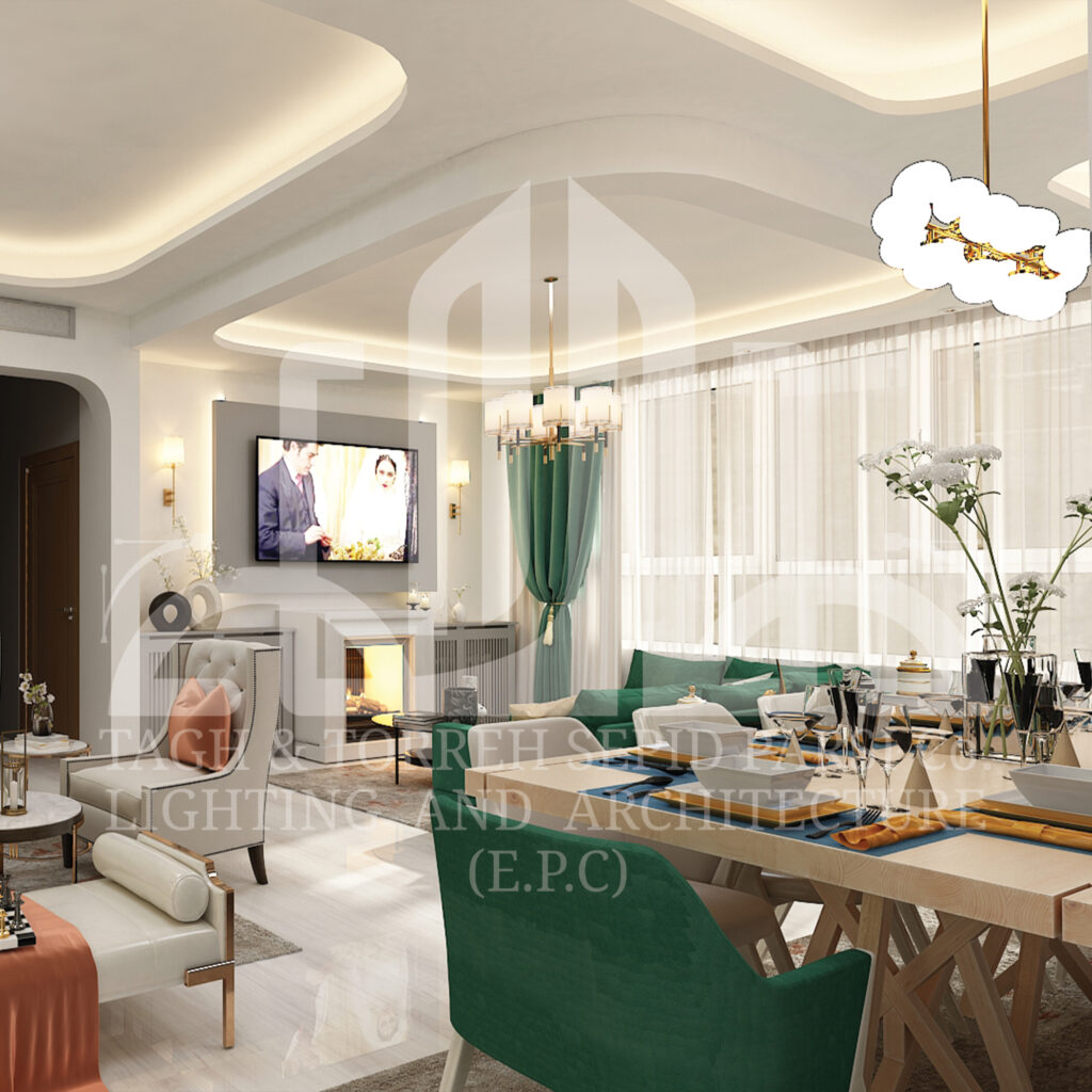 • ۵. دکوراسیون لوکس و منحصر به فرد: در طراحی داخلی این پروژه از مبلمان و جزئیات دکوراتیو منحصر به فرد استفاده شده است که نشان‌دهنده دکوراسیون لوکس و زیبایی‌شناسی طراحی داخلی است. انتخاب رنگ‌های آرامش‌بخش و هماهنگ با مبلمان باعث ایجاد فضایی خاص و دلنشین در خانه شده است.