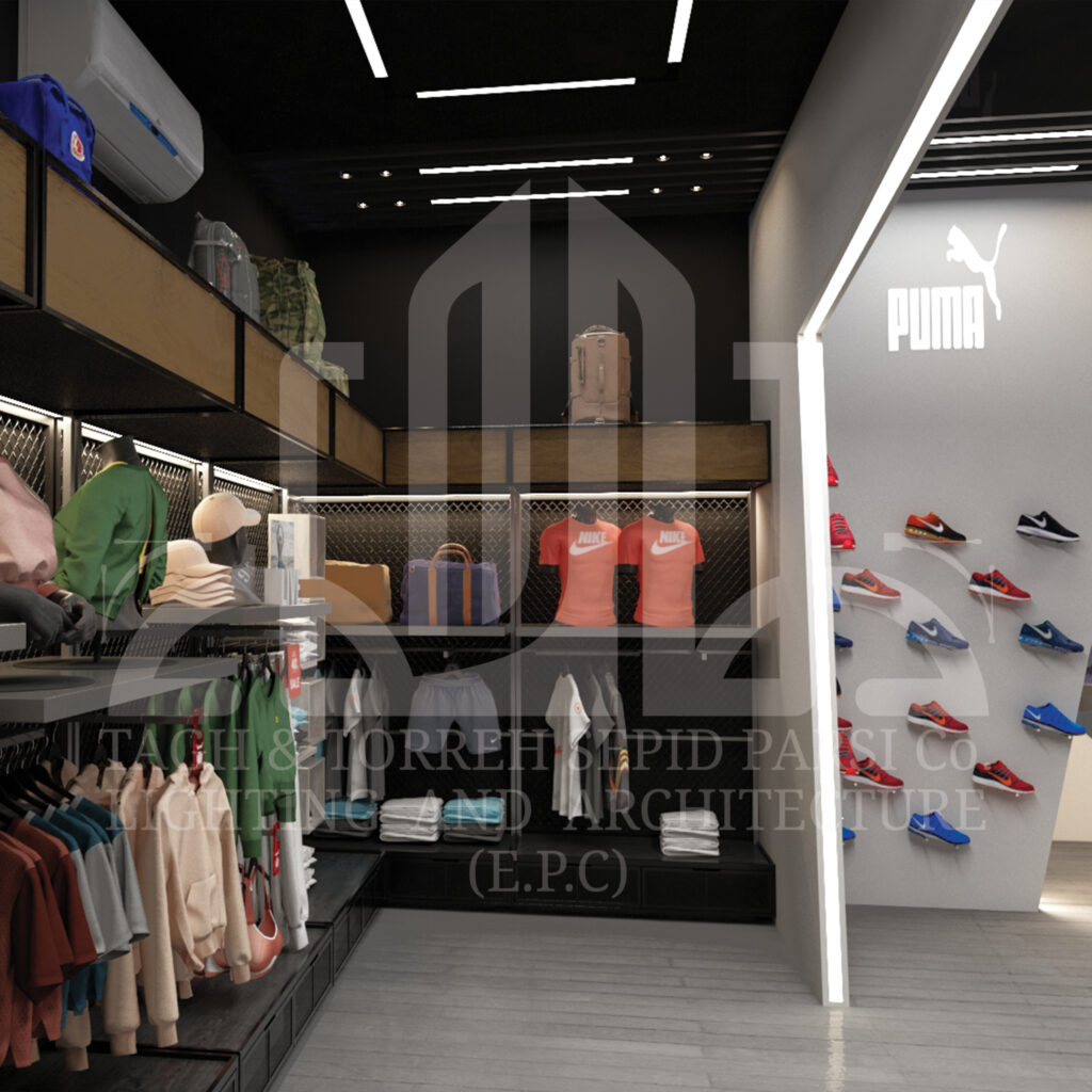 - ۱. طراحی معماری فروشگاه لوازم ورزشی متناسب با هویت برند: ایجاد فضایی مدرن، جذاب و هماهنگ با ماهیت محصولات ورزشی برای افزایش حس انرژی و پویایی در محیط.