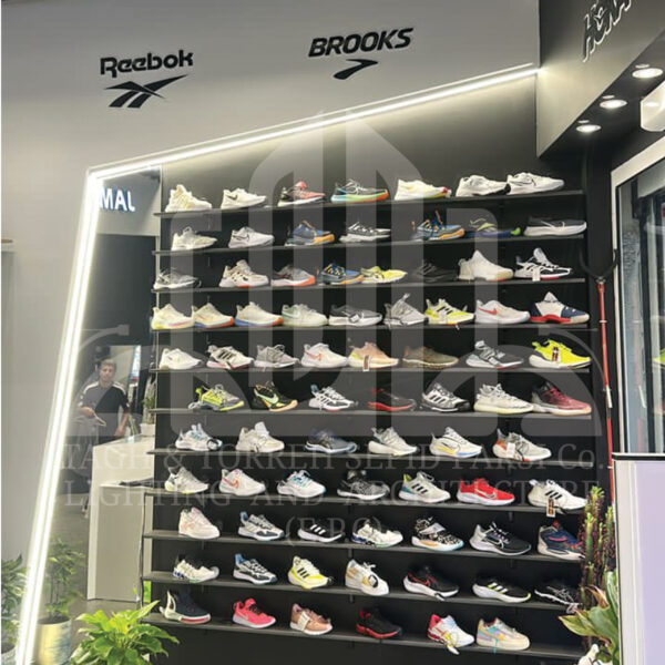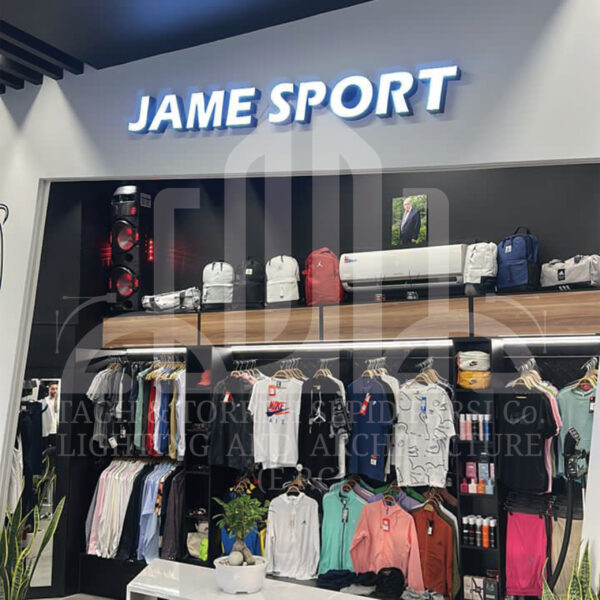 - ۴. طراحی ویترین و قفسهبندی فروشگاه: اجرای استندها و شلفهای مدرن با ترکیب متریال فلز و چوب برای نمایش اصولی پوشاک و تجهیزات ورزشی.