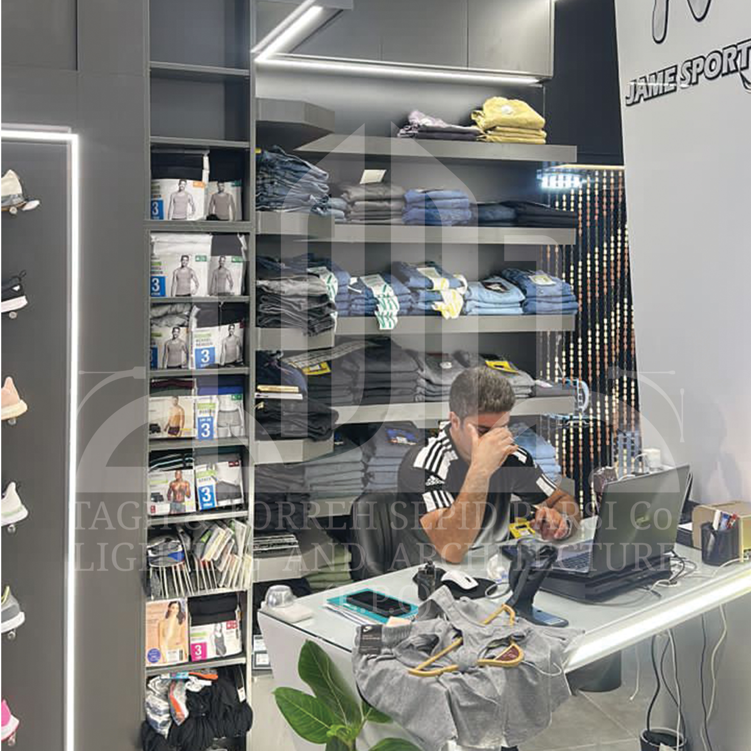 - ۳. نورپردازی فروشگاهی حرفهای: استفاده از سیستمهای نورپردازی عمومی و نورهای تأکیدی جهت برجستهسازی کالاها، ویترینها و نقاط کانونی فروشگاه.
