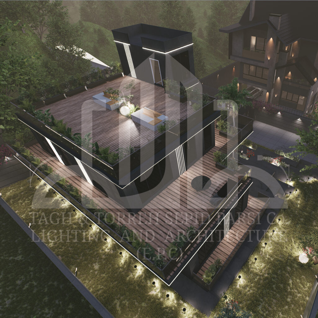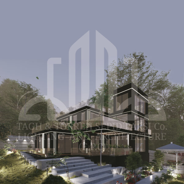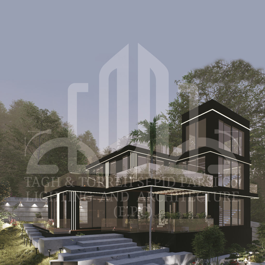 ترکیب متریالهای لوکس با نورپردازی ظریف، جلوهای شیک و متفاوت به این بنا بخشیده است. شب هنگام، نورهای ملایم، ویلا را همچون جواهری در دل طبیعت نمایان میکنند.